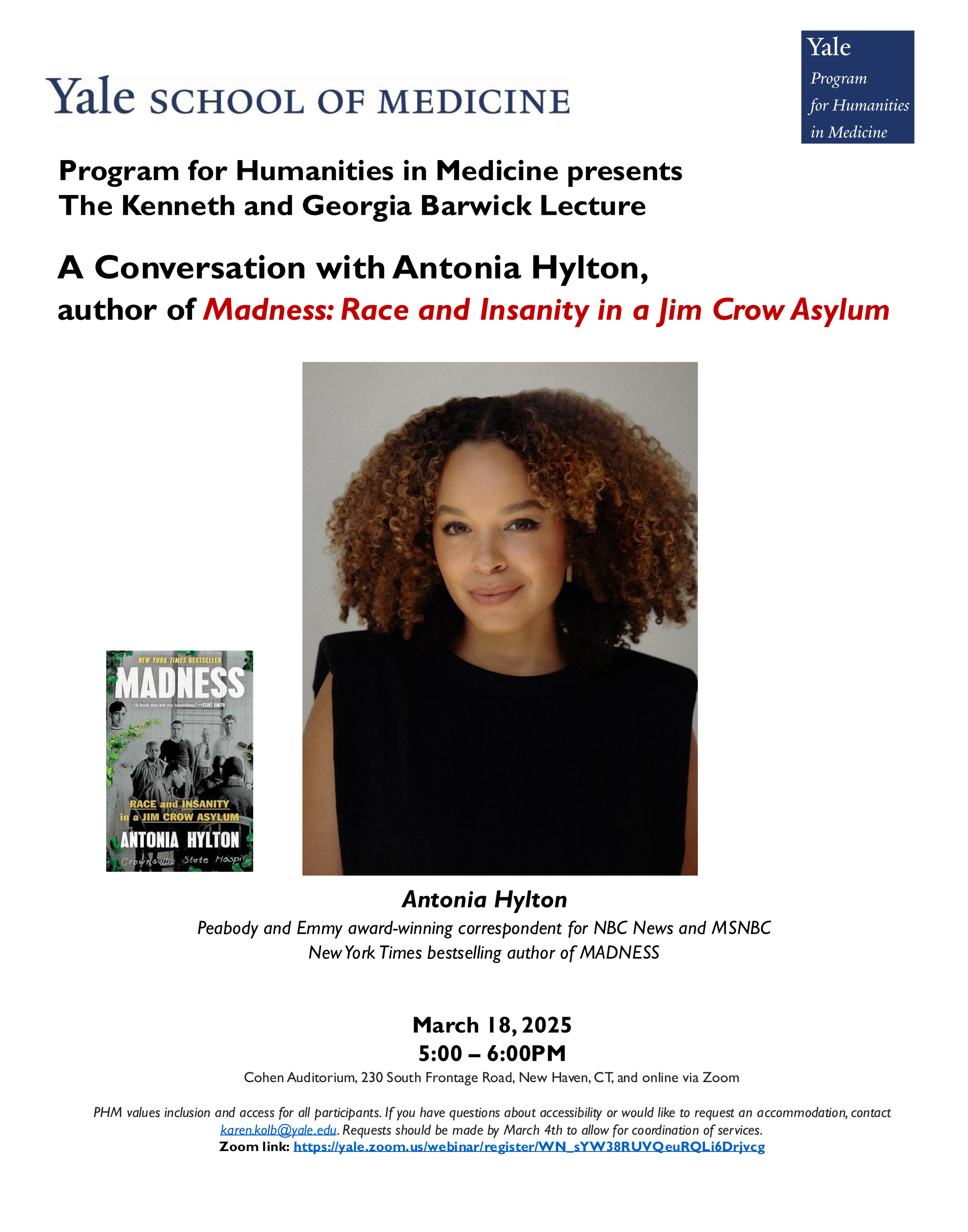 Program for Humanities in Medicine Barwick Lecture: A Conversation with Antonia Hylton, author of Madness: Race and Insanity in a Jim Crow Asylum