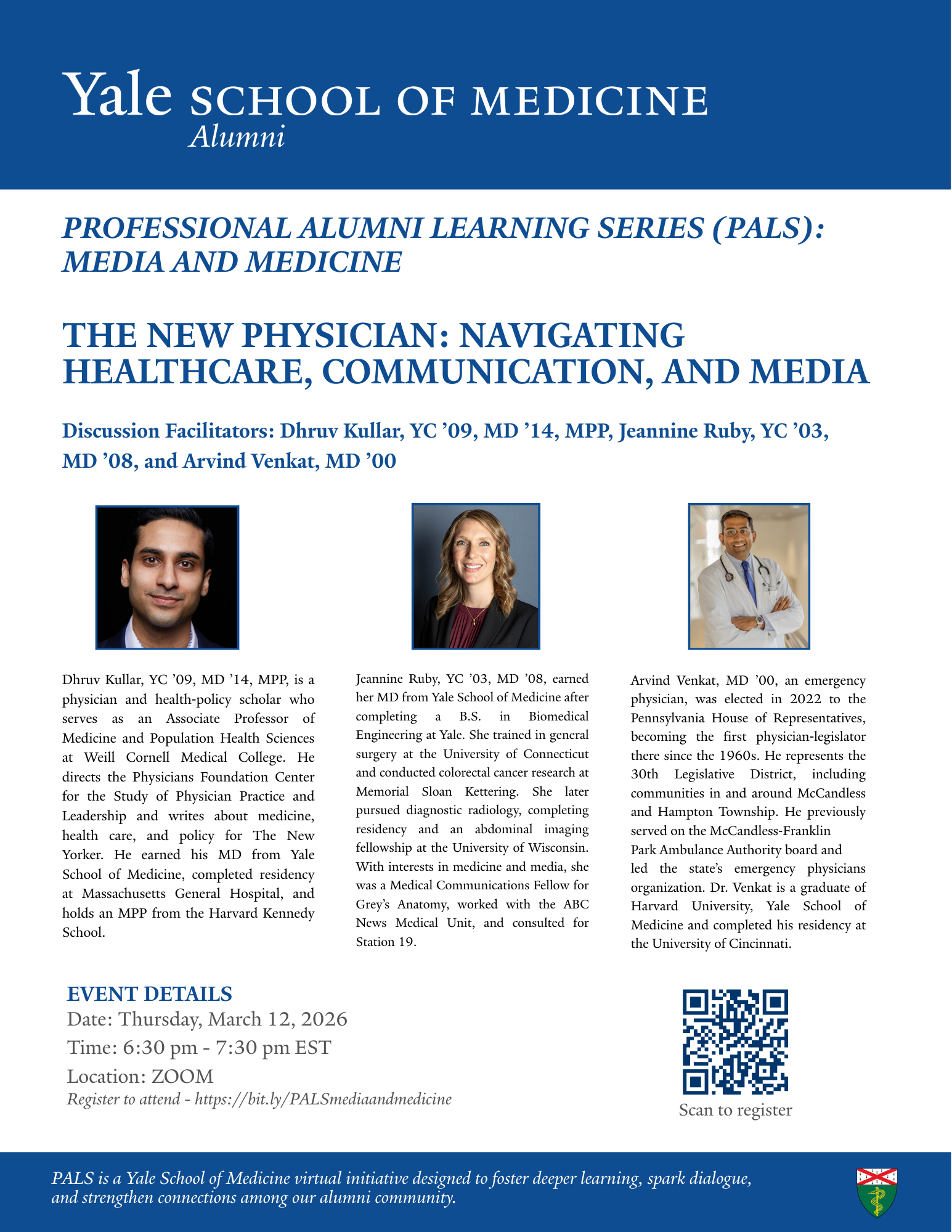 Professional Alumni Learning Series (PALS) on the intersection of Medicine and Media. This virtual initiative is designed to foster meaningful discussions among our YSM alumni.
