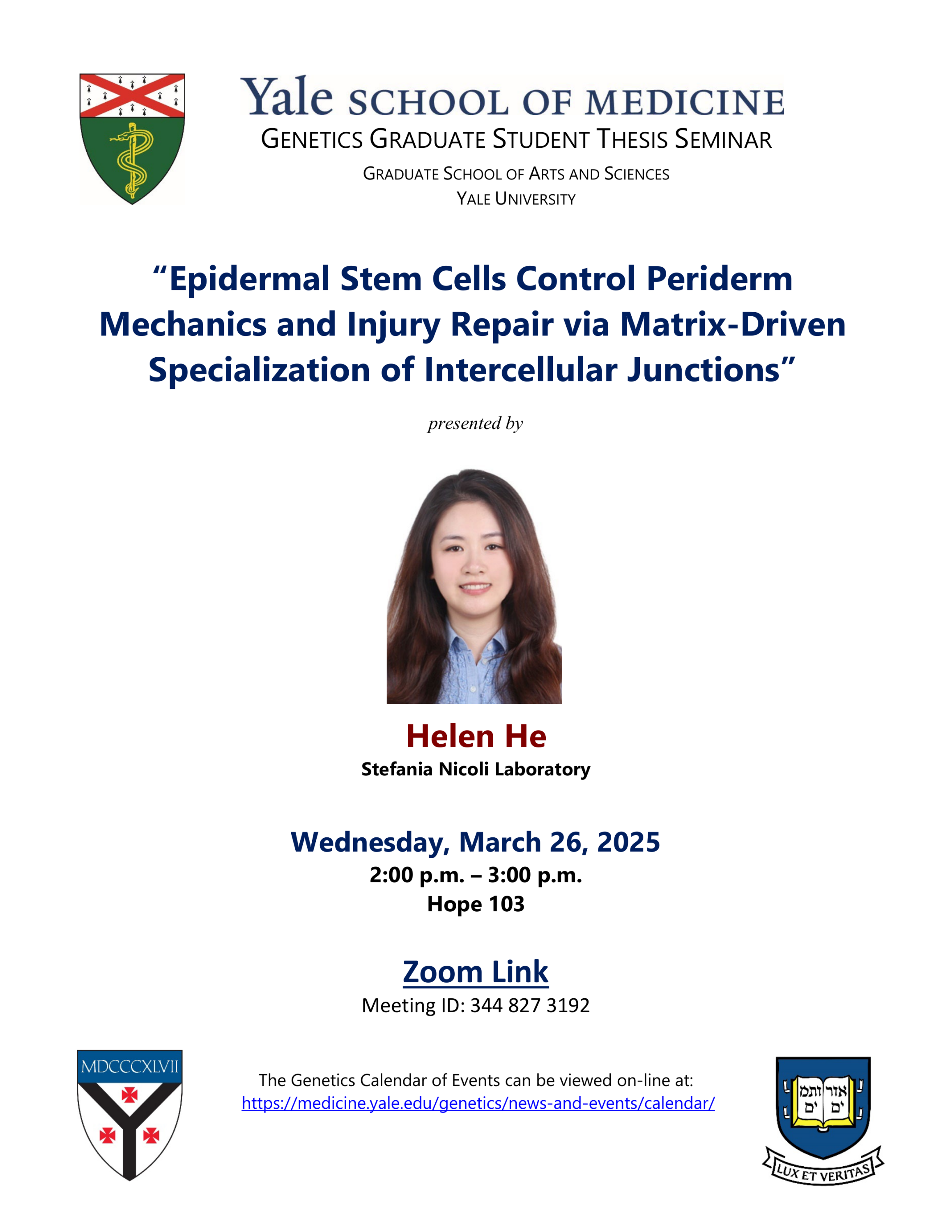 Everyone (Public)Genetics Thesis SeminarSterling Hall of Medicine, I-WingAdd event to CalendarSpeakerMengze Helen HeContactJames Longjames.long@yale.eduHostStefania Nicoli, PhD, FAHAstefania.nicoli@yale.eduHost OrganizationGeneticsAdmissionFreeEvent TypeLectures and SeminarsFoodCoffee and SnacksMar 202526Wednesday2:00 PM3:00 PMDownload FlyerEdit This Event