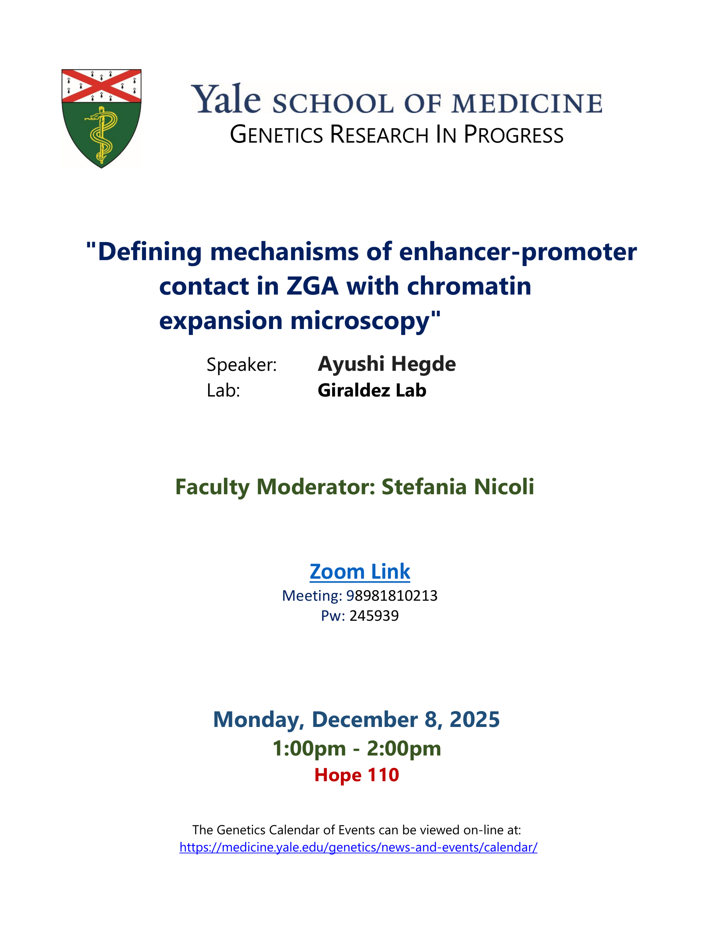 Yale OnlyGenetics Research-In-ProgressHope Memorial BuildingAdd event to CalendarAdd event series to CalendarSpeakerAyushi HegdeContactJames Longjames.long@yale.eduHostStefania Nicoli, PhD, FAHAstefania.nicoli@yale.eduHost OrganizationGeneticsAdmissionFreeEvent TypeLectures and SeminarsFoodLunchNext upcoming occurrences of this eventApr 202620TomorrowEventGenetics Research-In-Progress (RIP)Speakers: Adriana Vélez-Avilés, Paul Renauer1:00 PM2:00 PMApr 202627MondayEventGenetics Research-In-Progress (RIP)Speakers: Mackenzie Noon, Cara Ly1:00 PM2:00 PMMay 202611MondayEventGenetics Research-In-Progress (RIP)Speakers: Pieter Martino, Fiona Sievers1:00 PM2:00 PMDec 20258Monday1:00 PM2:00 PMDownload FlyerEdit This Event