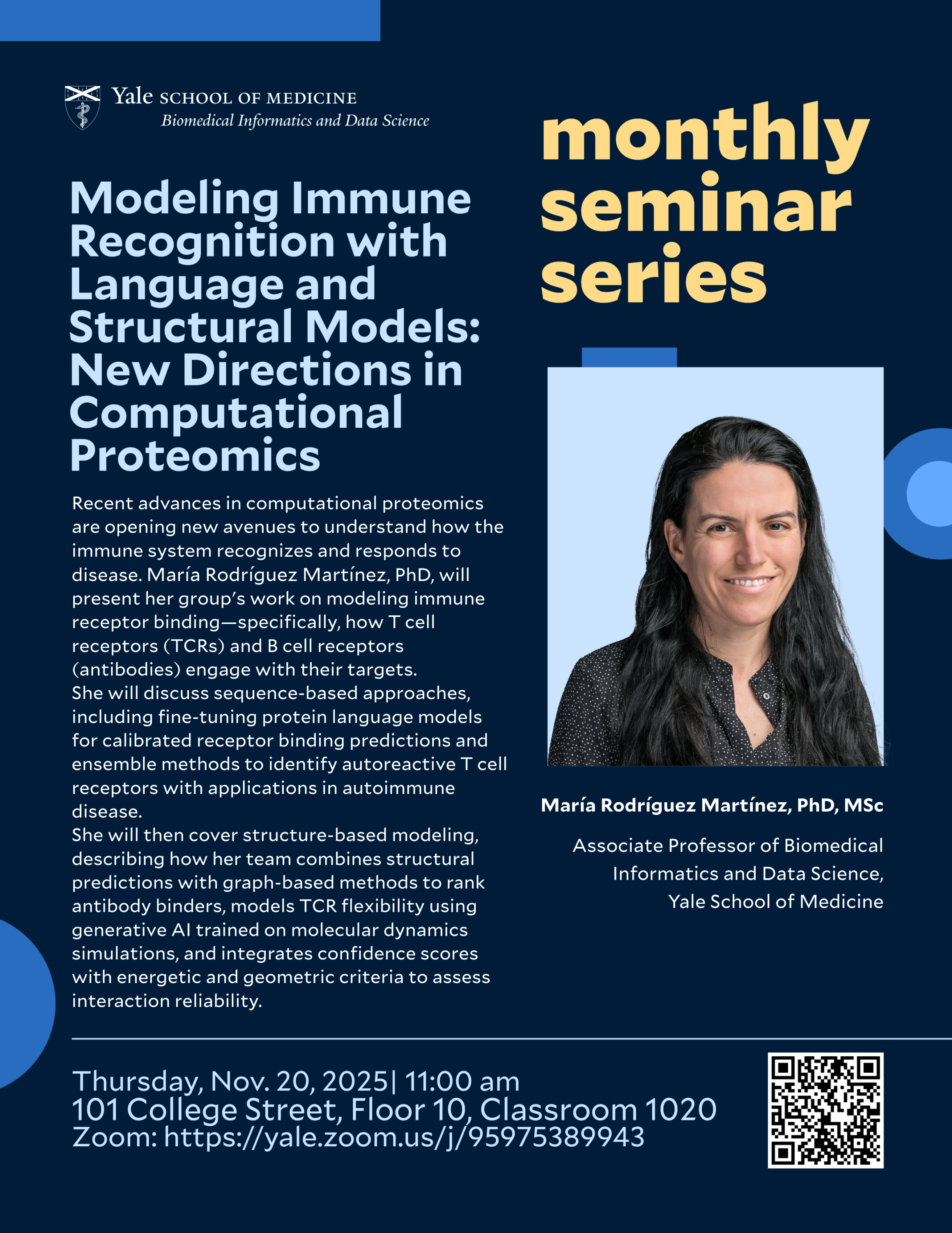 Recent advances in computational proteomics are opening new avenues to understand how the immune system recognizes and responds to disease. María Rodríguez Martínez, PhD, will present her group's work on modeling immune receptor binding—specifically, how T cell receptors (TCRs) and B cell receptors (antibodies) engage with their targets.