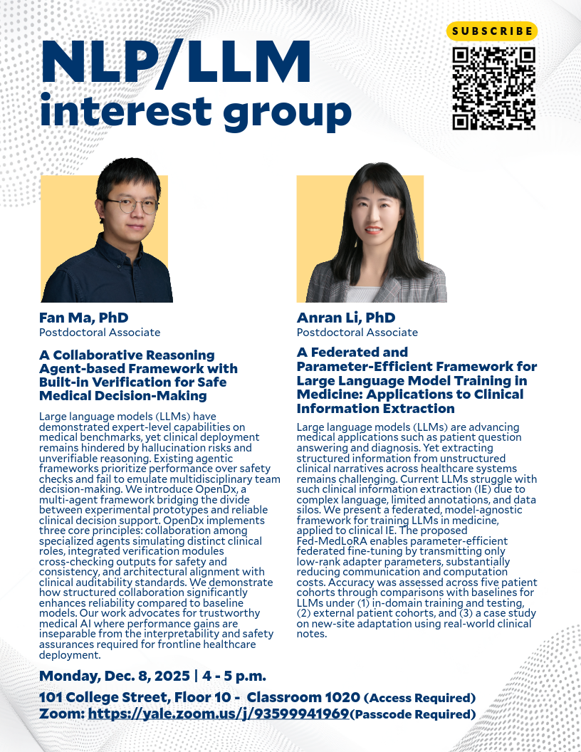 Abstract: Large language models (LLMs) have demonstrated expert-level capabilities on medical benchmarks, yet translating these achievements into clinical practice is impeded by persistent risks of hallucination and a lack of verifiable reasoning. While emerging agentic frameworks have begun to address these limitations through multi-step planning, existing systems often prioritize performance optimization over rigorous safety checks and fail to emulate the collective decision-making of multidisciplinary teams. To address these critical gaps, we introduce OpenDx, a multi-agent framework designed to bridge the divide between experimental prototypes and reliable clinical decision support. OpenDx is built upon three core principles: collaboration among specialized agents that simulate distinct clinical roles, integrated verification modules that strictly cross-check outputs for safety and consistency, and an architectural alignment with clinical auditability standards. We present the design and evaluation of OpenDx, demonstrating how structured collaboration significantly enhance reliability compared to baseline models. Our work advocates for a new paradigm of trustworthy medical AI, where performance gains are inseparable from the interpretability and safety assurances required for frontline healthcare deployment. - A Federated and Parameter-Efficient Framework for Large Language Model Training in Medicine: Applications to Clinical Information Extraction by Anran Li, PhD