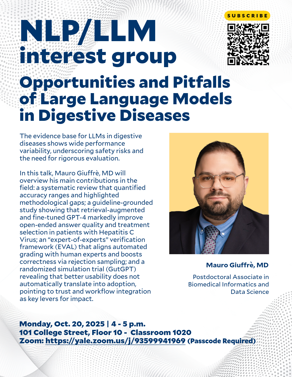 In this talk, Mauro Giuffrè, MD will overview his main contributions in the field: a systematic review that quantified accuracy ranges and highlighted methodological gaps; a guideline-grounded study showing that retrieval-augmented and fine-tuned GPT-4 markedly improve open-ended answer quality and treatment selection in patients with Hepatitis C Virus; an “expert-of-experts” verification framework (EVAL) that aligns automated grading with human experts and boosts correctness via rejection sampling; and a randomized simulation trial (GutGPT) revealing that better usability does not automatically translate into adoption, pointing to trust and workflow integration as key levers for impact.