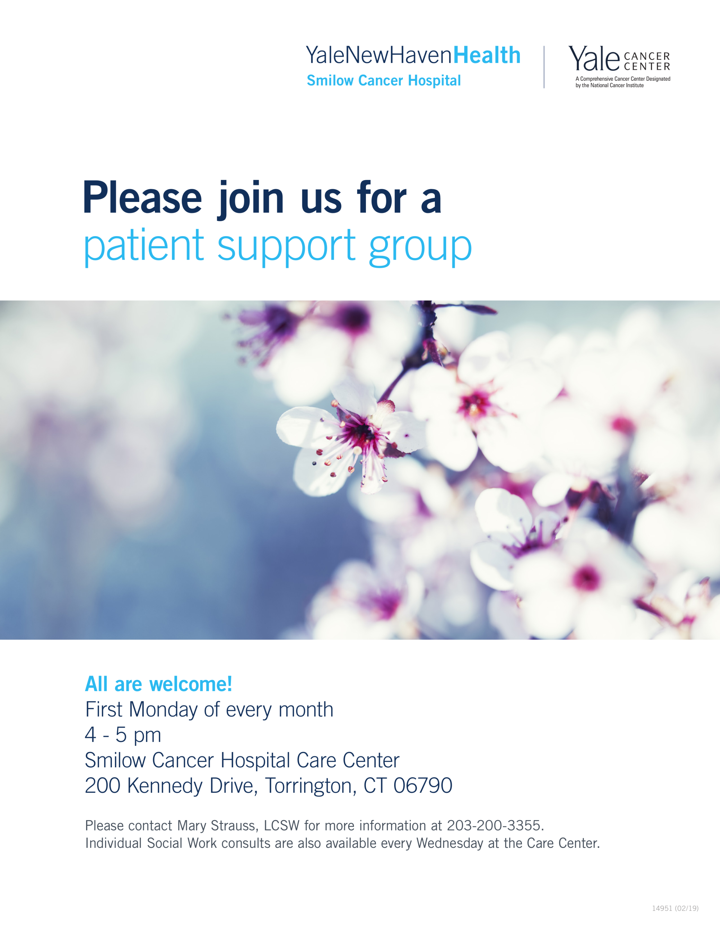 Everyone (Public)Yale Cancer Center Sponsors: "Patient Support Group"Smilow Cancer Hospital at TorringtonAdd event to CalendarAdd event series to CalendarContactMary Strauss, LCSW203.200.3355mary.strauss@ynhh.orgAdmissionFreeEvent TypeHealth/WellnessNext upcoming occurrences of this eventFeb 20262MondayEventYale Cancer Center Sponsors: "Patient Support Group"4:00 PM5:00 PMMar 20262MondayEventYale Cancer Center Sponsors: "Patient Support Group"4:00 PM5:00 PMApr 20266MondayEventYale Cancer Center Sponsors: "Patient Support Group"4:00 PM5:00 PMJan 20265Monday4:00 PM5:00 PMDownload FlyerTorrington Support Group Flyer FINALEdit This Event