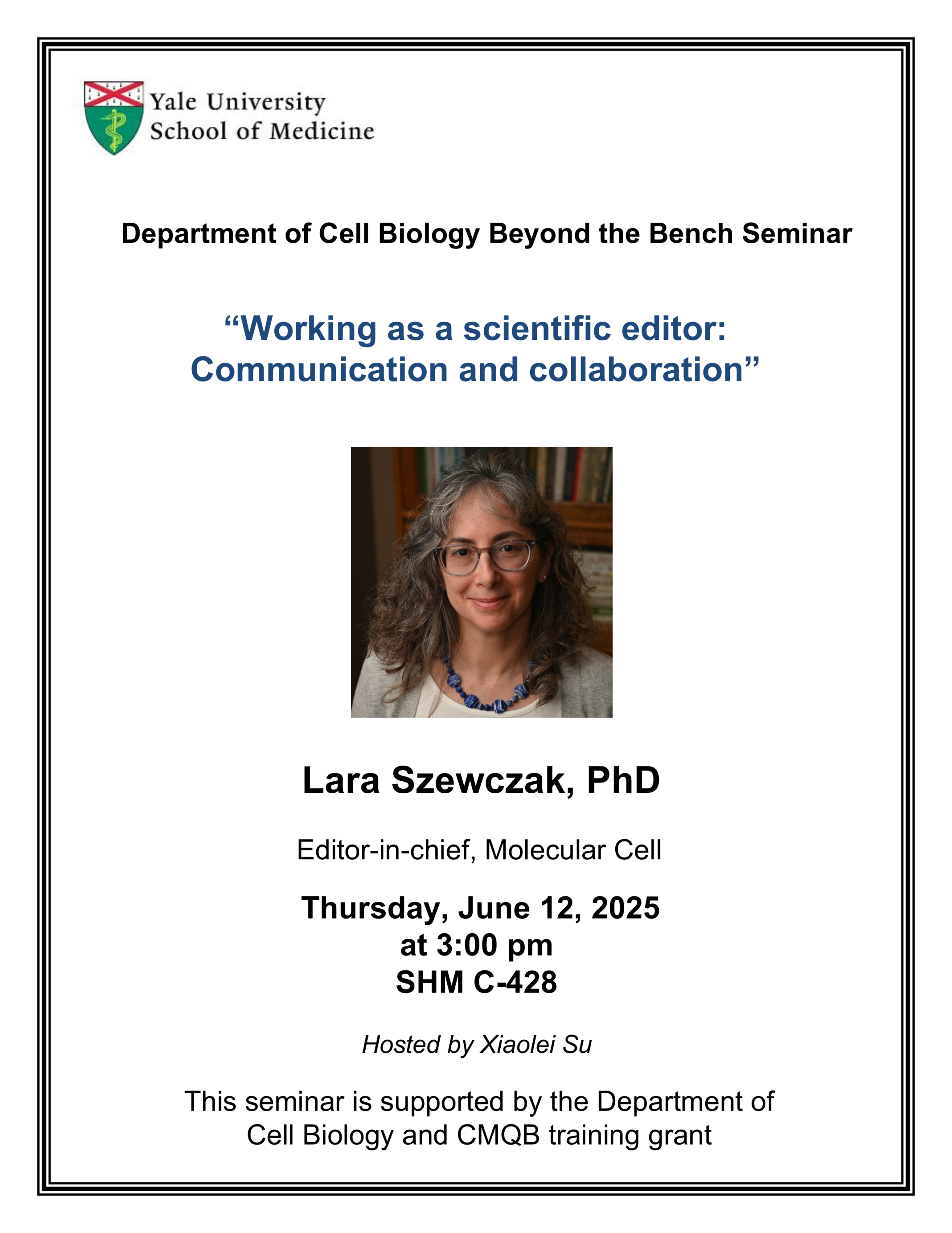 Please join us for a Beyond the Bench seminar on Thursday, June 12th, 2025, at 3:00pm in SHM C-428. Lara Szewczak, Editor in Chief with Molecular Cell, will be discussing her work as a scientific editor.