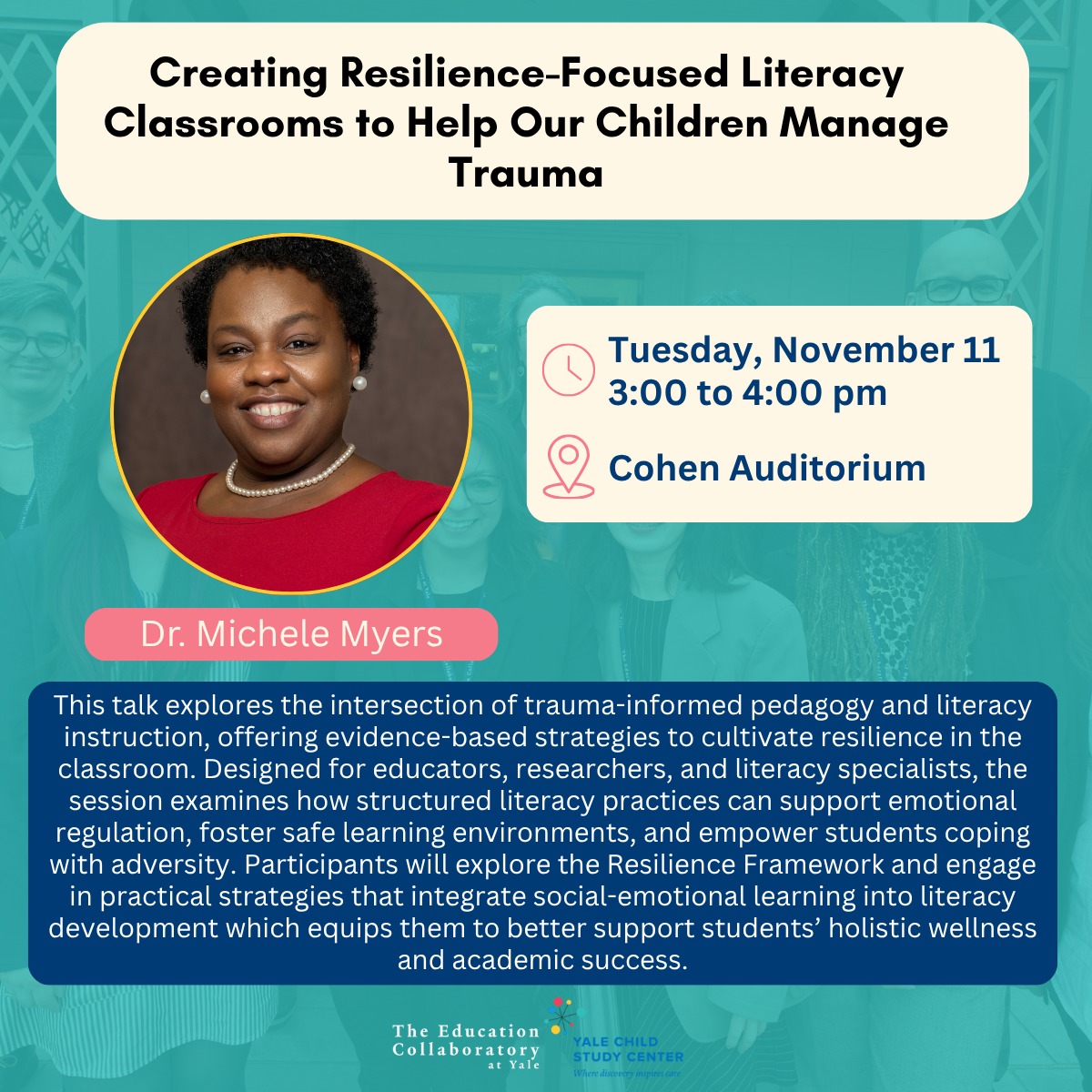 Join Michele Myers, PhD, visiting assistant professor at Yale Child Study Center, for an engaging afternoon talk exploring the intersection of trauma-informed pedagogy and literacy instruction. Evidence-based strategies to cultivate resilience in the classroom will also be provided.