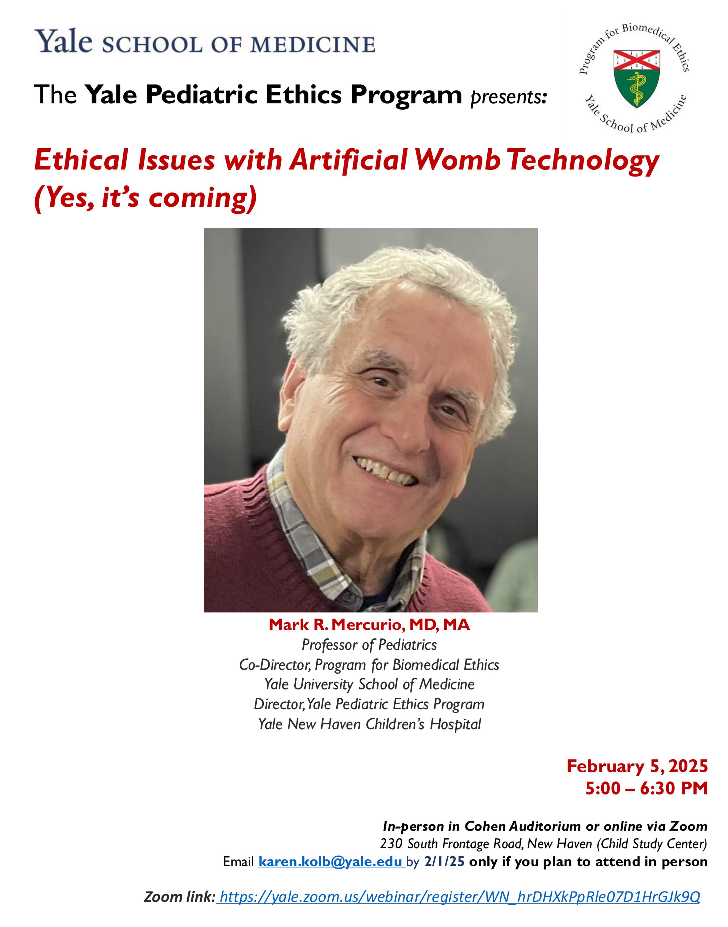 Yale Pediatric Ethics Program presents: Ethical Issues with Artificial Womb Technology (Yes, it’s coming) with Mark R. Mercurio, MD, MA