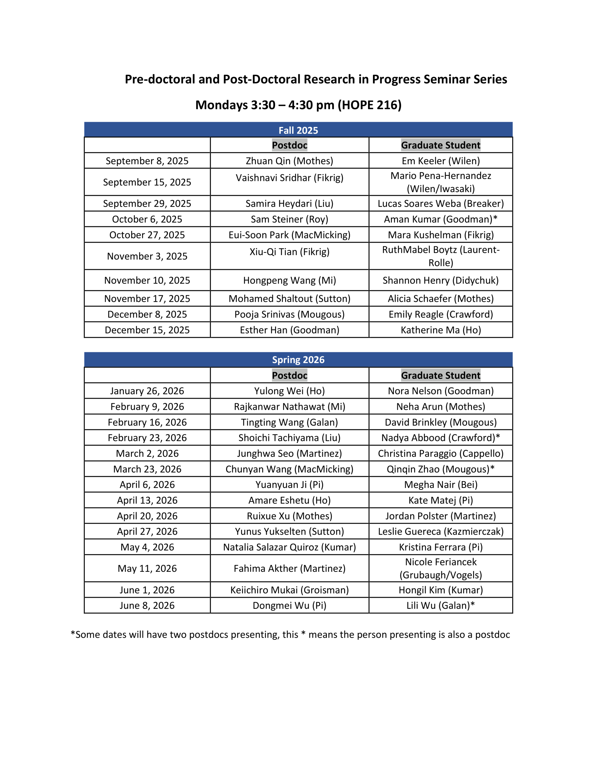 25-26 Microbiology Pre-Doctoral and Post-Doctoral Research in Progress Seminar Series: 4/20/26