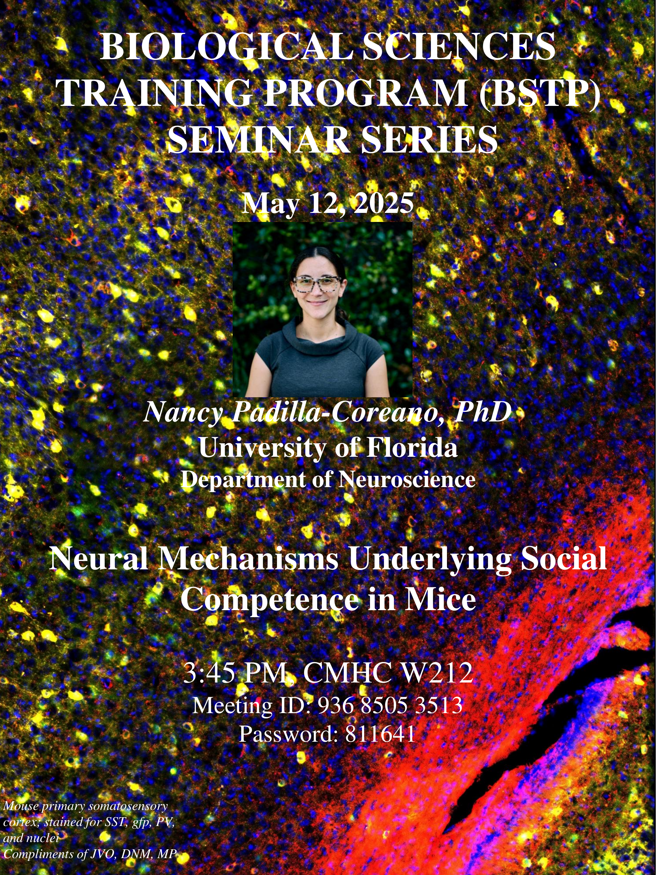 Dr. Nancy Padilla-Coreano, Ph.D., Assistant Professor in the Department of Neuroscience at the University of Florida, will be giving the BSTP seminar. Her talk is entitled, "Neural Mechanisms Underlying Social Competence in Mice". The seminar is hosted by the Department of Molecular Psychiatry.