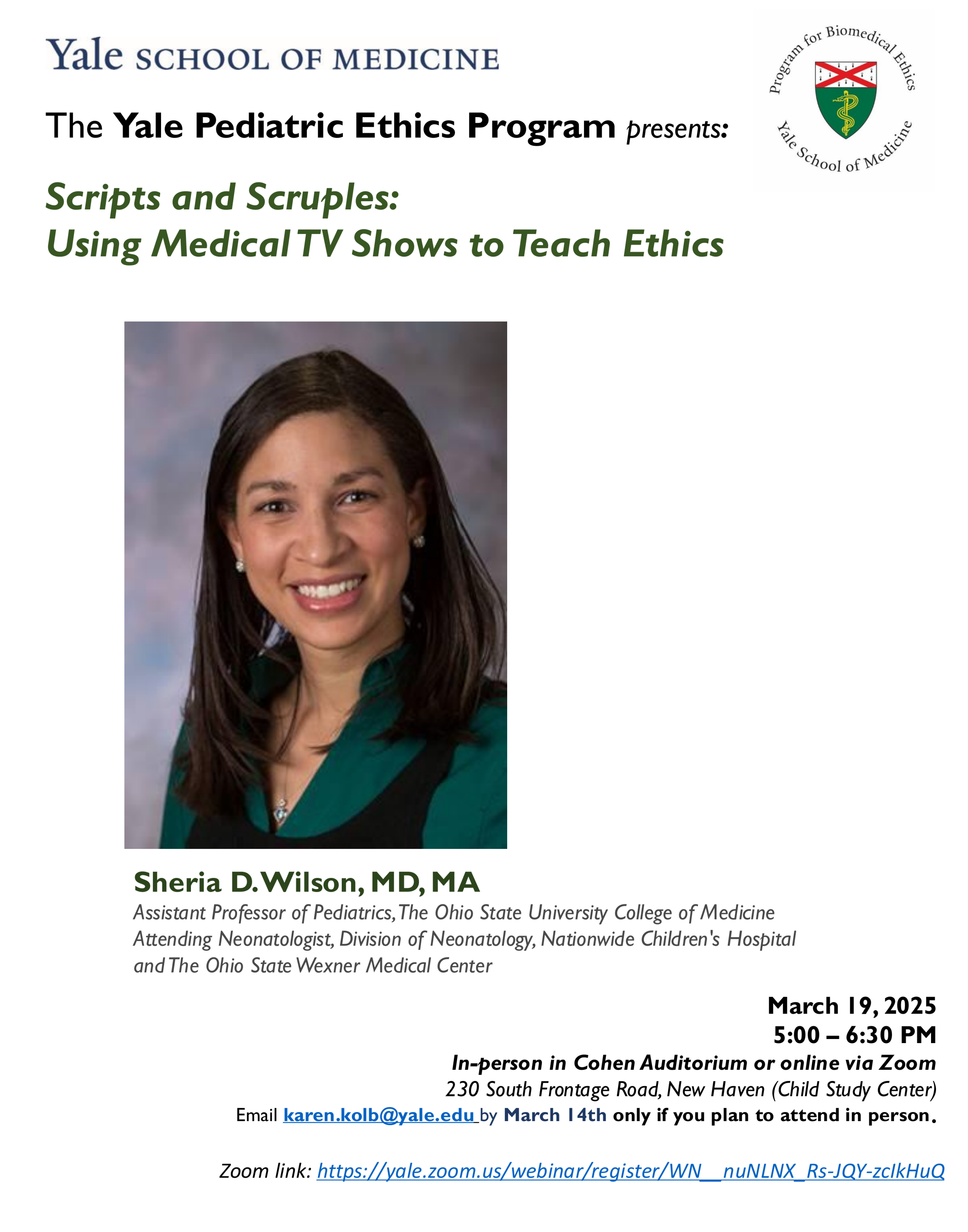 Yale Pediatric Ethics Program and Program for Biomedical Ethics present: Scripts and Scruples: Using Medical TV Shows to Teach Ethics with Sheria D. Wilson, MD, MA