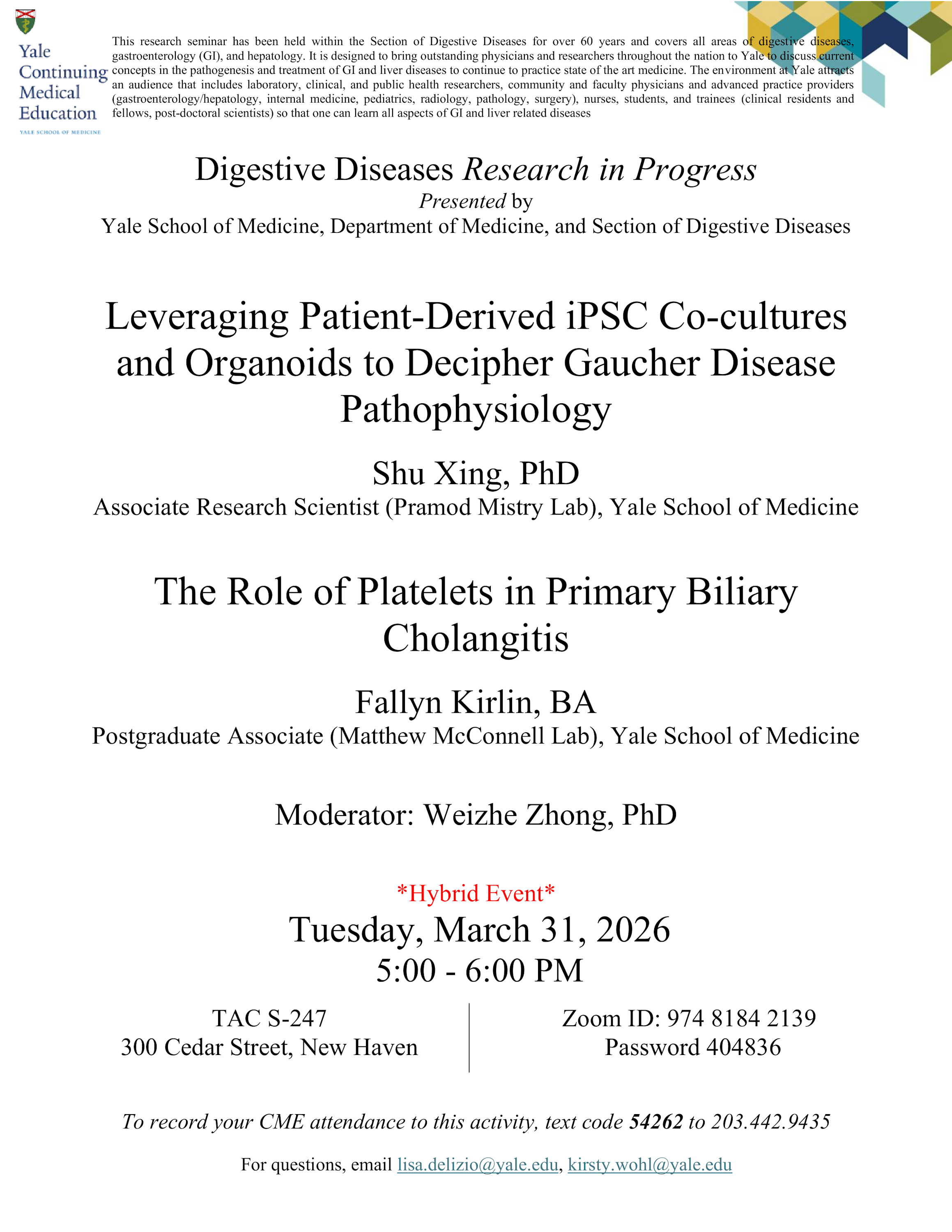 1. Leveraging Patient-Derived iPSC Co-cultures and Organoids to Decipher Gaucher Disease Pathophysiology 2.The Role of Platelets in Primary Biliary Cholangitis