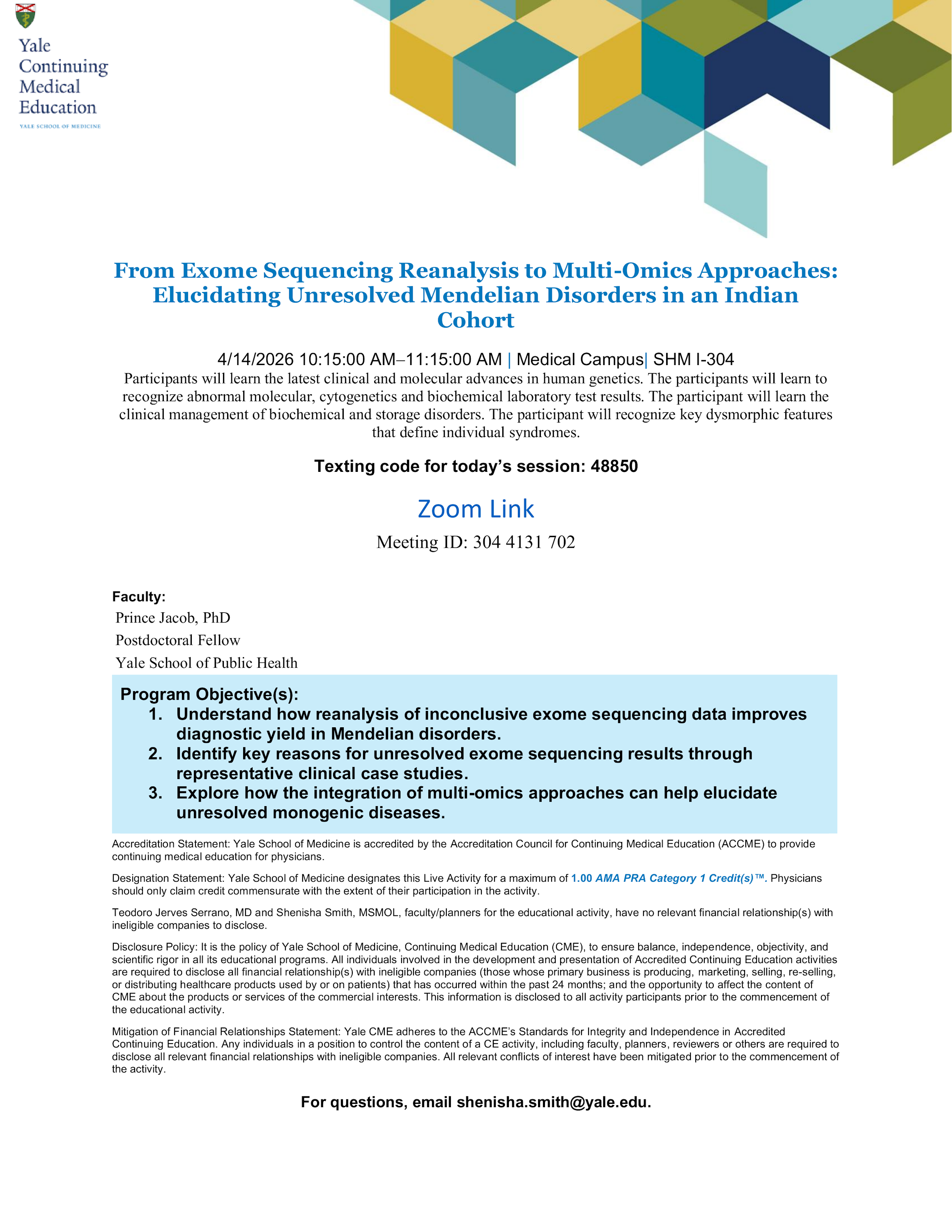 Yale OnlyGenetics Clinical Grand Rounds: "From Exome Sequencing Reanalysis to Multi-Omics Approaches: Elucidating Unresolved Mendelian Disorders in an Indian Cohort"Sterling Hall of Medicinehttps://yale.zoom.us/j/3044131702Add event to CalendarAdd event series to CalendarSpeakerPrince Jacob, PhD, MScContactShenisha Smith, MS, BSshenisha.smith@yale.eduHostTeodoro Jerves Serrano, MD, FACMGteodoro.jervesserrano@yale.eduAdmissionFreeEvent TypeLectures and SeminarsTagsGeneticsGrand RoundsNext upcoming occurrences of this eventApr 202621TodayEventGenetics Clinical Grand Rounds: "From Acute Adolescent-Onset Psychosis to Genetic Diagnosis: A De Novo Null Variant in GRIA3 Expands the Clinical Spectrum"Speaker: Deqiong Ma10:15 AM11:15 AMApr 202628TuesdayEventGenetics Clinical Grand Rounds: "Molecular Diagnosis of Fetal Anomalies."Speaker: Chen Zhao10:15 AM11:15 AMMay 20265TuesdayEventGenetics Clinical Grand Rounds:10:15 AM11:15 AMApr 202614Tuesday10:15 AM11:15 AMDownload FlyerEdit This Event