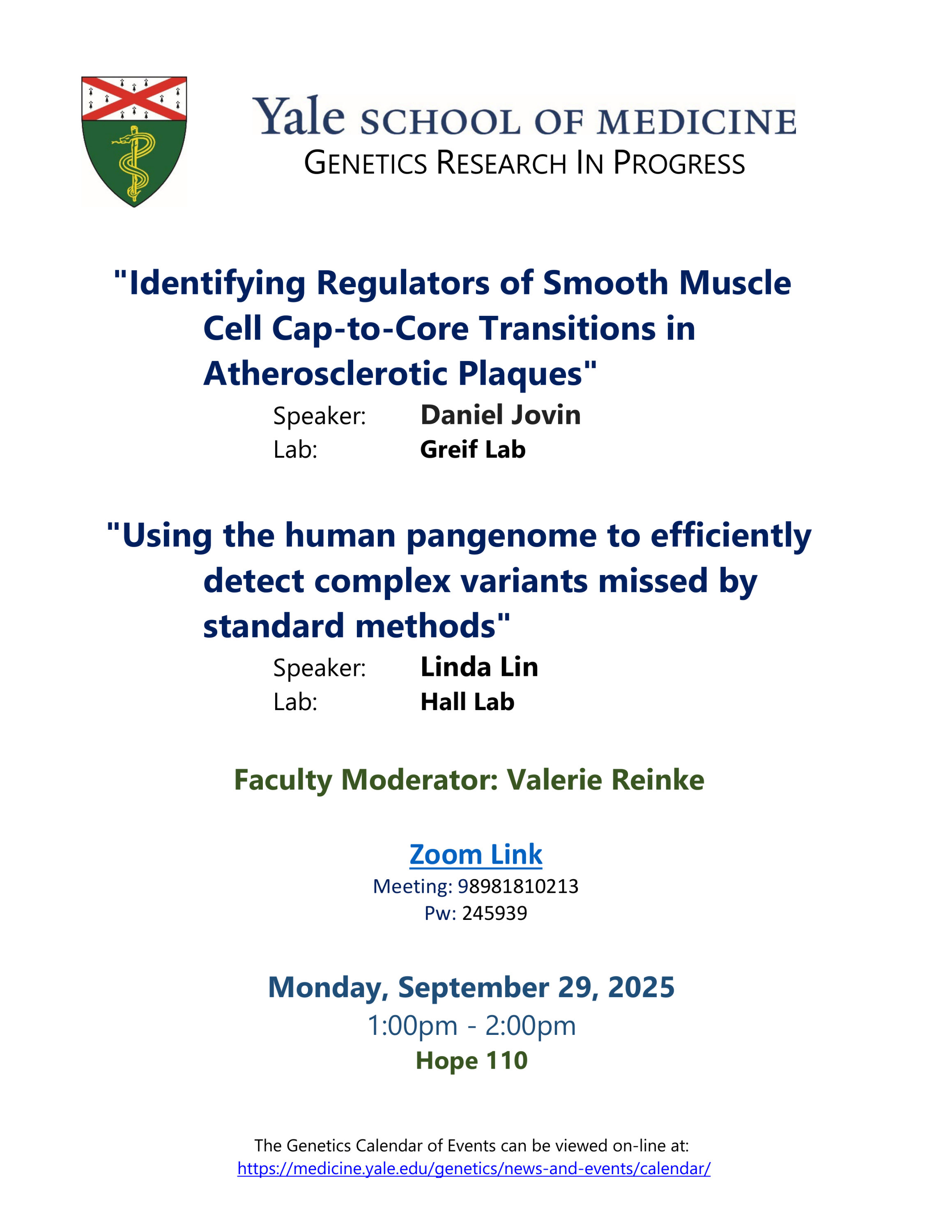 Yale OnlyGenetics Research-In-ProgressHope Memorial BuildingAdd event to CalendarAdd event series to CalendarSpeakersDaniel G. JovinMD-PhD Student, MD-PhD ProgramLinda LinContactJames Longjames.long@yale.eduHostValerie Reinke, PhDvalerie.reinke@yale.eduHost OrganizationGeneticsAdmissionFreeEvent TypeLectures and SeminarsFoodLunchNext upcoming occurrences of this eventFeb 20262MondayEventGenetics Research-In-Progress (RIP)Speakers: Annabel Devault, Emma Murari1:00 PM2:00 PMFeb 20269MondayEventGenetics Research-In-Progress (RIP)Speaker: Tova Finkelstein1:00 PM2:00 PMFeb 202616MondayEventGenetics Research-In-Progress (RIP)Speakers: Jason Hou, Jared Akers1:00 PM2:00 PMSep 202529Monday1:00 PM2:00 PMDownload FlyerEdit This Event