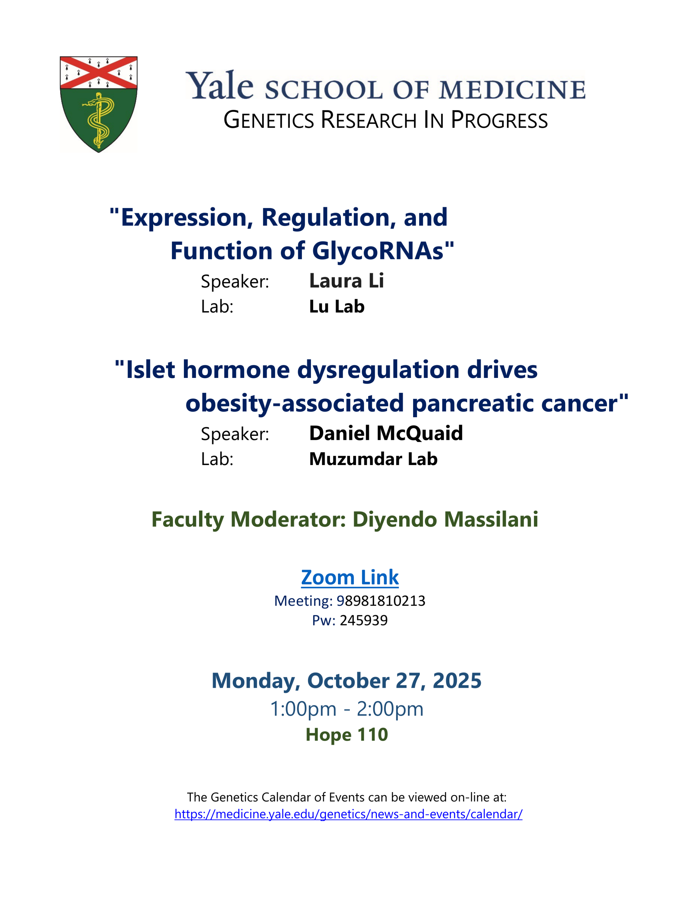 Yale OnlyGenetics Research-In-ProgressHope Memorial BuildingAdd event to CalendarAdd event series to CalendarSpeakersDaniel McQuaidMD/PhD StudentLuoyi LiContactJames Longjames.long@yale.eduHostDiyendo MassilaniHost OrganizationGeneticsAdmissionFreeEvent TypeLectures and SeminarsFoodLunchNext upcoming occurrences of this eventFeb 20262MondayEventGenetics Research-In-Progress (RIP)Speaker: Annabel Devault1:00 PM2:00 PMFeb 20269MondayEventGenetics Research-In-Progress (RIP)Speaker: Tova Finkelstein1:00 PM2:00 PMFeb 202616MondayEventGenetics Research-In-Progress (RIP)Speakers: Jason Hou, Jared Akers1:00 PM2:00 PMOct 202527Monday1:00 PM2:00 PMDownload FlyerEdit This Event