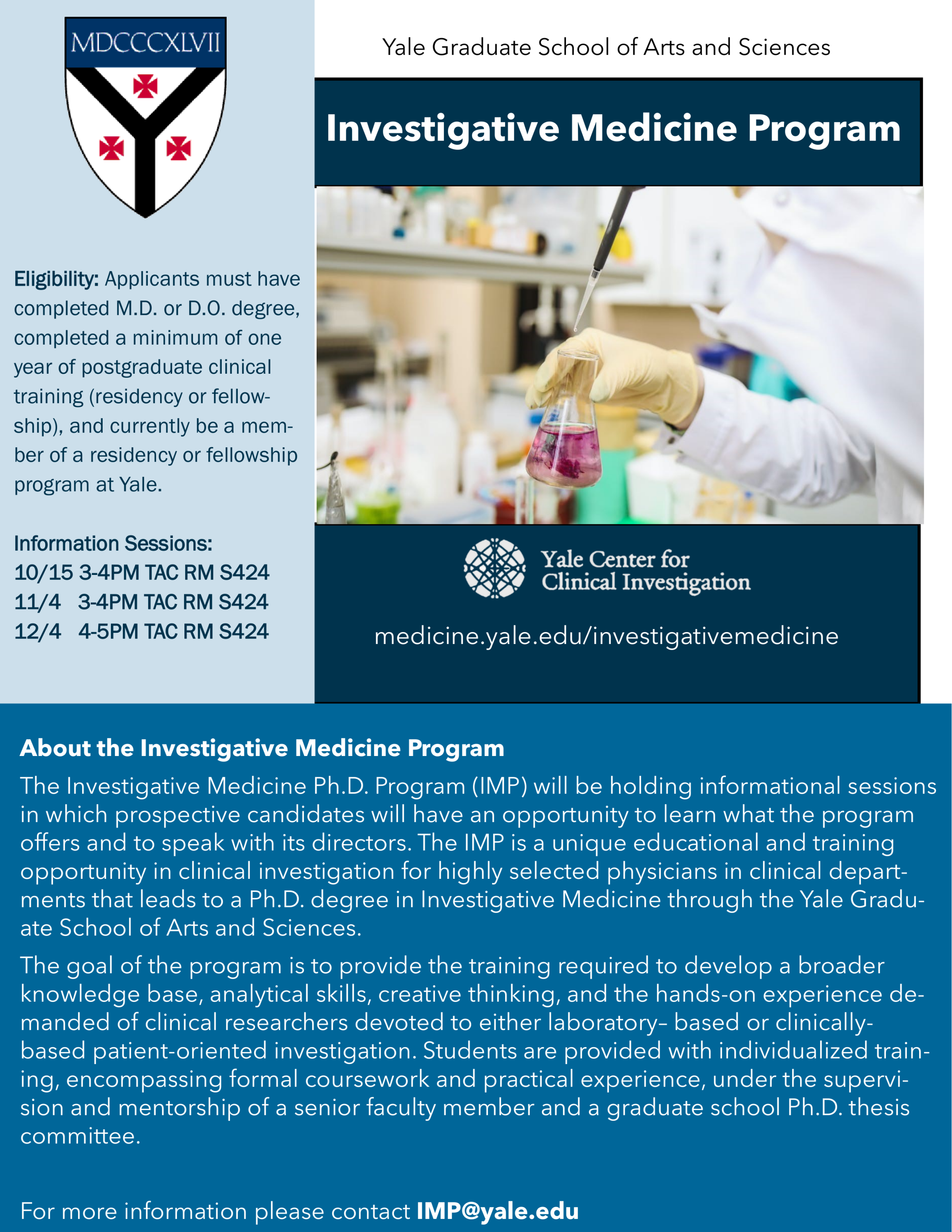 Are you a physician interested in advancing your career through rigorous research training while continuing your clinical development? The Investigative Medicine Program at Yale Graduate School of Arts and Sciences offers a unique opportunity for physician–scientists to earn a Ph.D. in Investigative Medicine.