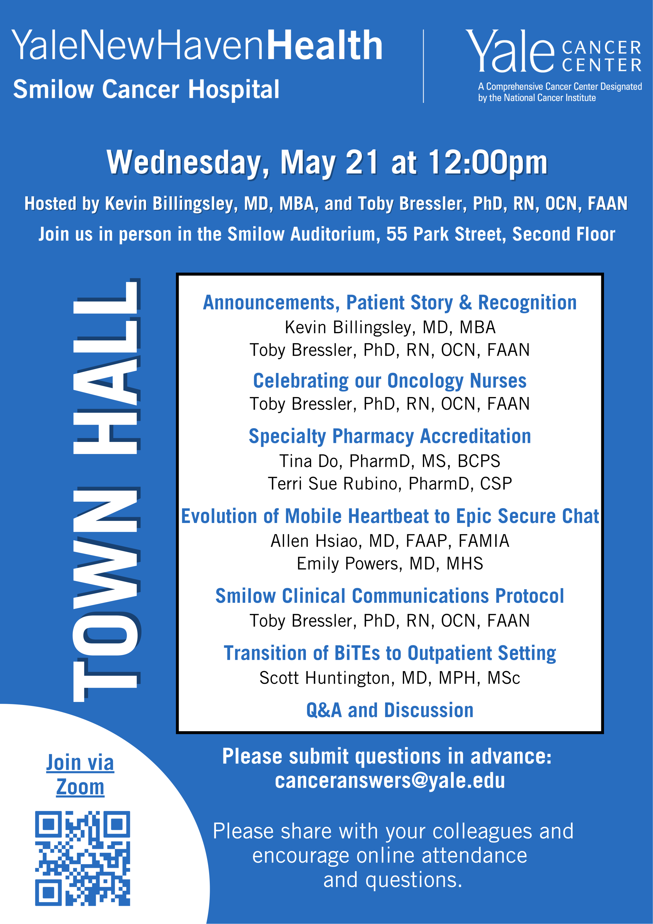 - Lori Pickens, MHASenior Vice President of Cancer Services; Executive Director of Smilow Cancer Hospital Yale New Haven Health System; Chief Administrative Officer for Yale Cancer and Yale School of Medicine