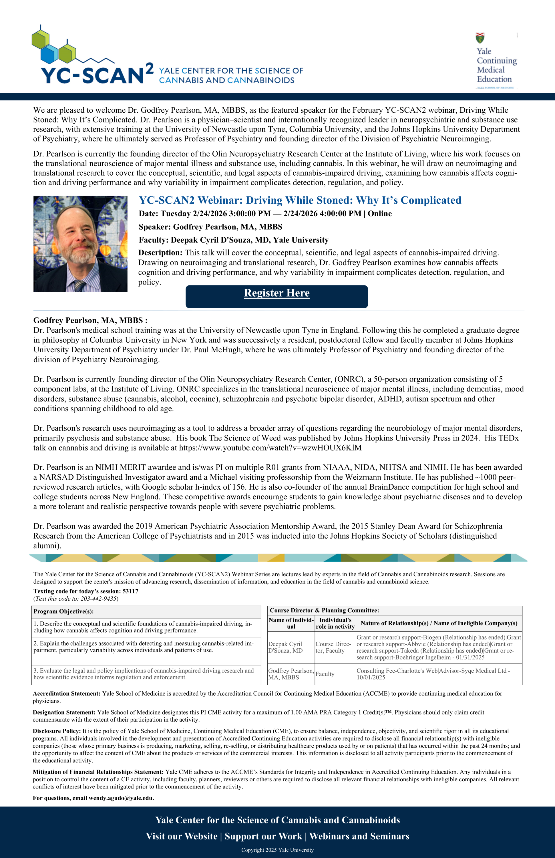 We are pleased to welcome Dr. Godfrey Pearlson, MA, MBBS, as the featured speaker for the February YC-SCAN2 webinar, Driving While