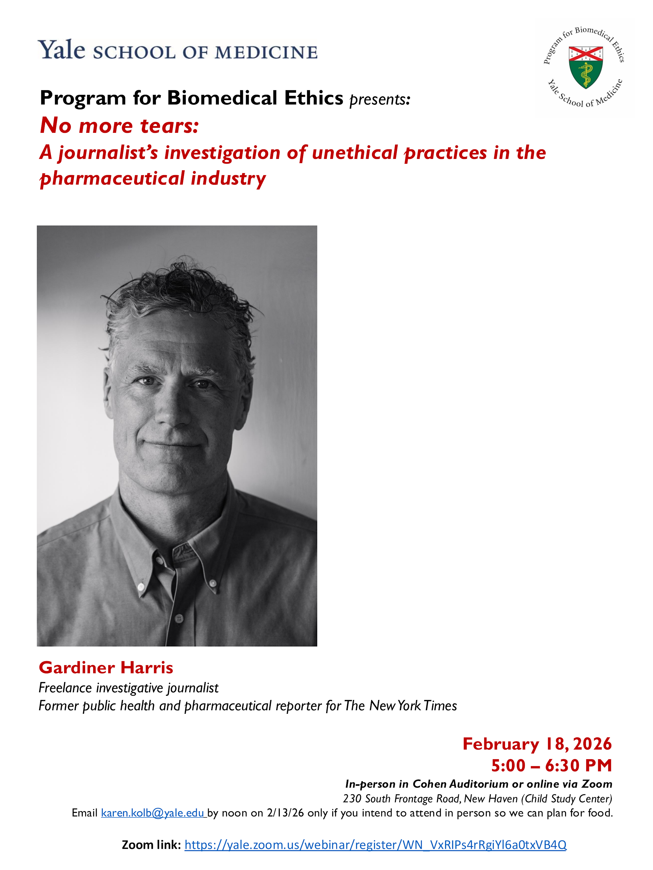 Program for Biomedical Ethics talk: No more tears: A journalist’s investigation of unethical practices in the pharmaceutical industry with Gardiner Harris