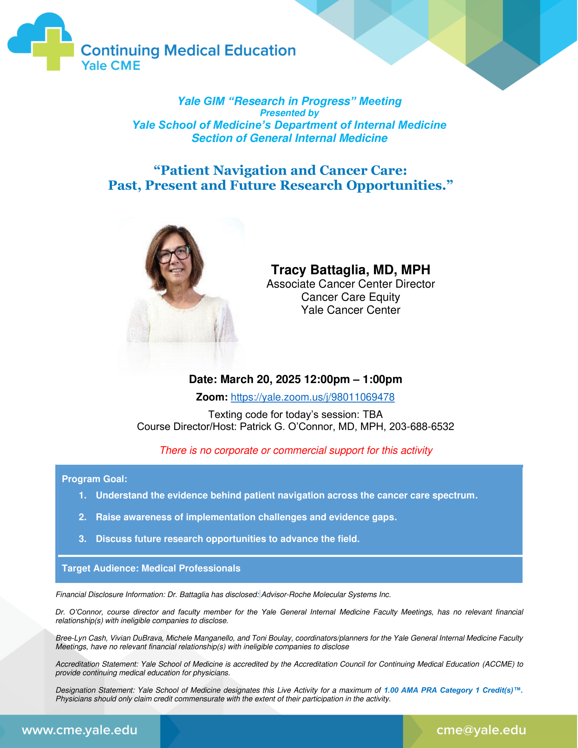 Yale OnlyYale GIM Research in Progress Meeting: “Patient Navigation and Cancer Care: Past, Present and Future Research Opportunities.”The Anlyan CenterAdd event to CalendarSpeakerTracy Battaglia, MD, MPHProfessor of Medicine (General Medicine); Associate Director, Community Outreach and Engagement, Yale Cancer CenterContactMichele Manganello203.907.9171michele.manganello@yale.eduHostPatrick G. O'Connor, MD, MPH, MACPpatrick.oconnor@yale.eduHost OrganizationGeneral Internal MedicineAdmissionFreeEvent TypeConferences and SymposiaMar 202520Thursday12:00 PM1:00 PMDownload FlyerEdit This Event