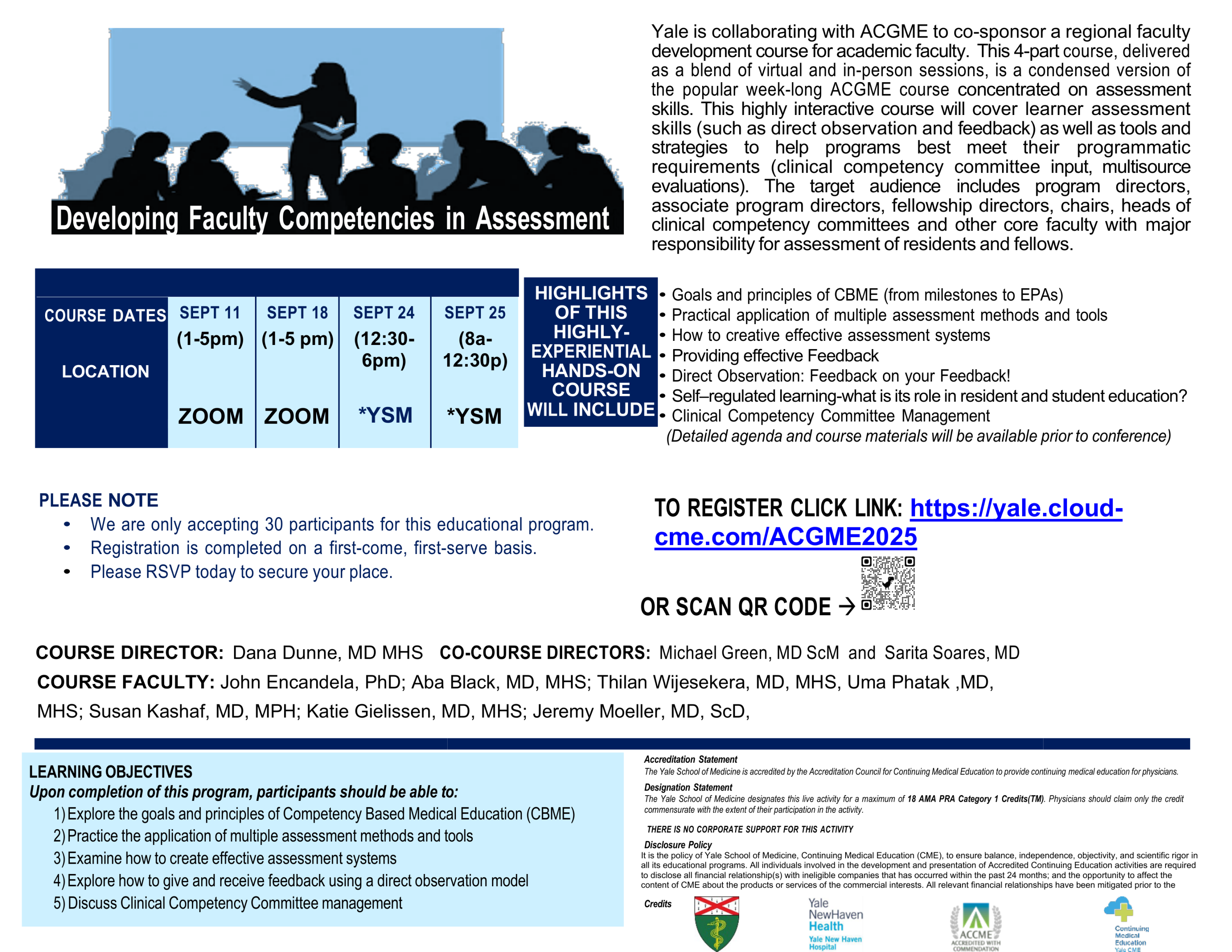 Yale is collaborating with ACGME to co-sponsor a regional faculty development course for academic faculty. This 4-part course, delivered as a blend of virtual and in-person sessions, is a condensed version of the popular week-long ACGME course concentrated on assessment skills. This highly interactive course will cover learner assessment skills (such as direct observation and feedback) as well as tools and strategies to help programs bestmeet their programmatic requirements (clinical competency committee input, multisource evaluations). The target audience includes program directors, associate program directors, fellowship directors, chairs, heads of clinical competency committees and other core faculty with major responsibility for assessment of residents and fellows.