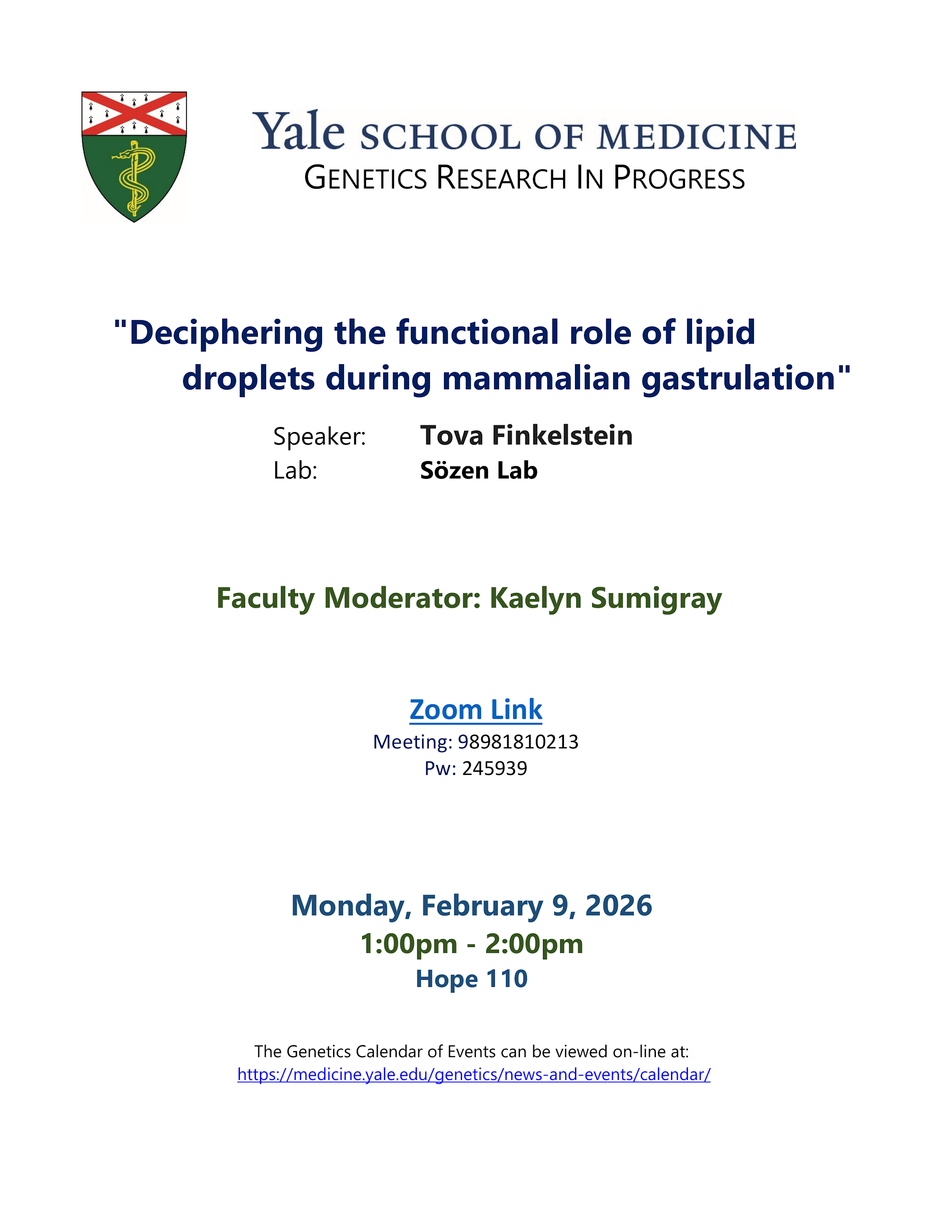 Yale OnlyGenetics Research-In-ProgressHope Memorial BuildingAdd event to CalendarAdd event series to CalendarSpeakerTova FinkelsteinContactJames Longjames.long@yale.eduHostKaelyn Sumigray, PhDkaelyn.sumigray@yale.eduHost OrganizationGeneticsAdmissionFreeEvent TypeLectures and SeminarsFoodLunchNext upcoming occurrences of this eventFeb 202616MondayEventGenetics Research-In-Progress (RIP)Speakers: Jason Hou, Jared Akers1:00 PM2:00 PMFeb 202623MondayEventGenetics Research-In-Progress (RIP)Speakers: Hannah Yin, Nandhini Sadagopan1:00 PM2:00 PMMar 20262MondayEventGenetics Research-In-Progress (RIP)Speakers: Ingrid Heumann, Benjamin Walters1:00 PM2:00 PMFeb 20269Monday1:00 PM2:00 PMDownload FlyerEdit This Event