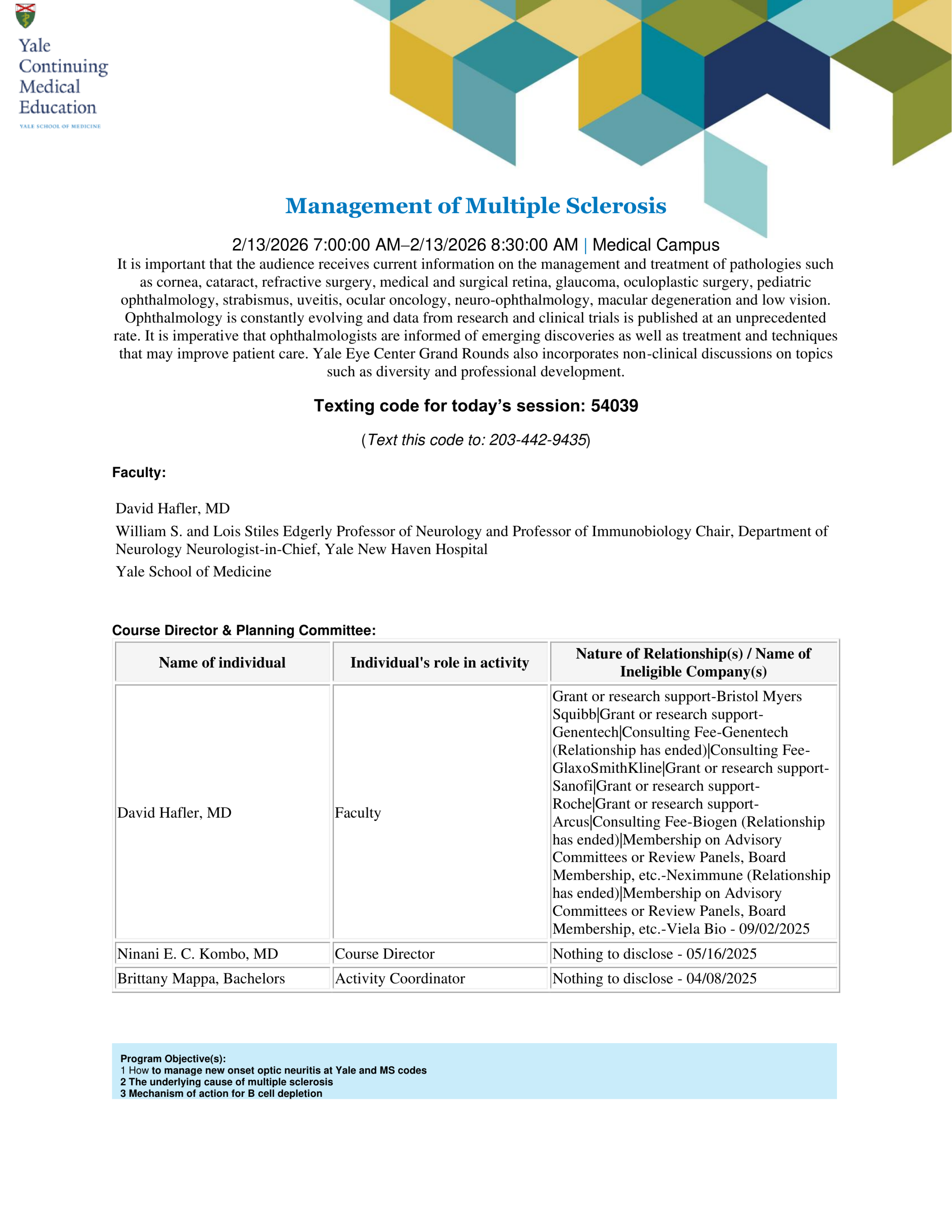 Everyone (Public)YEC Grand Rounds 2.13.26Add event to CalendarSpeakerDavid A. Hafler, MD, FANAWilliam S. and Lois Stiles Edgerly Professor of Neurology and Professor of ImmunobiologyContactBrittany Mappabrittany.mappa@yale.eduHostNinani Kombo, MDAdmissionFreeEvent TypeGrand RoundsFeb 202613Friday7:00 AM8:15 AMDownload FlyerEdit This Event