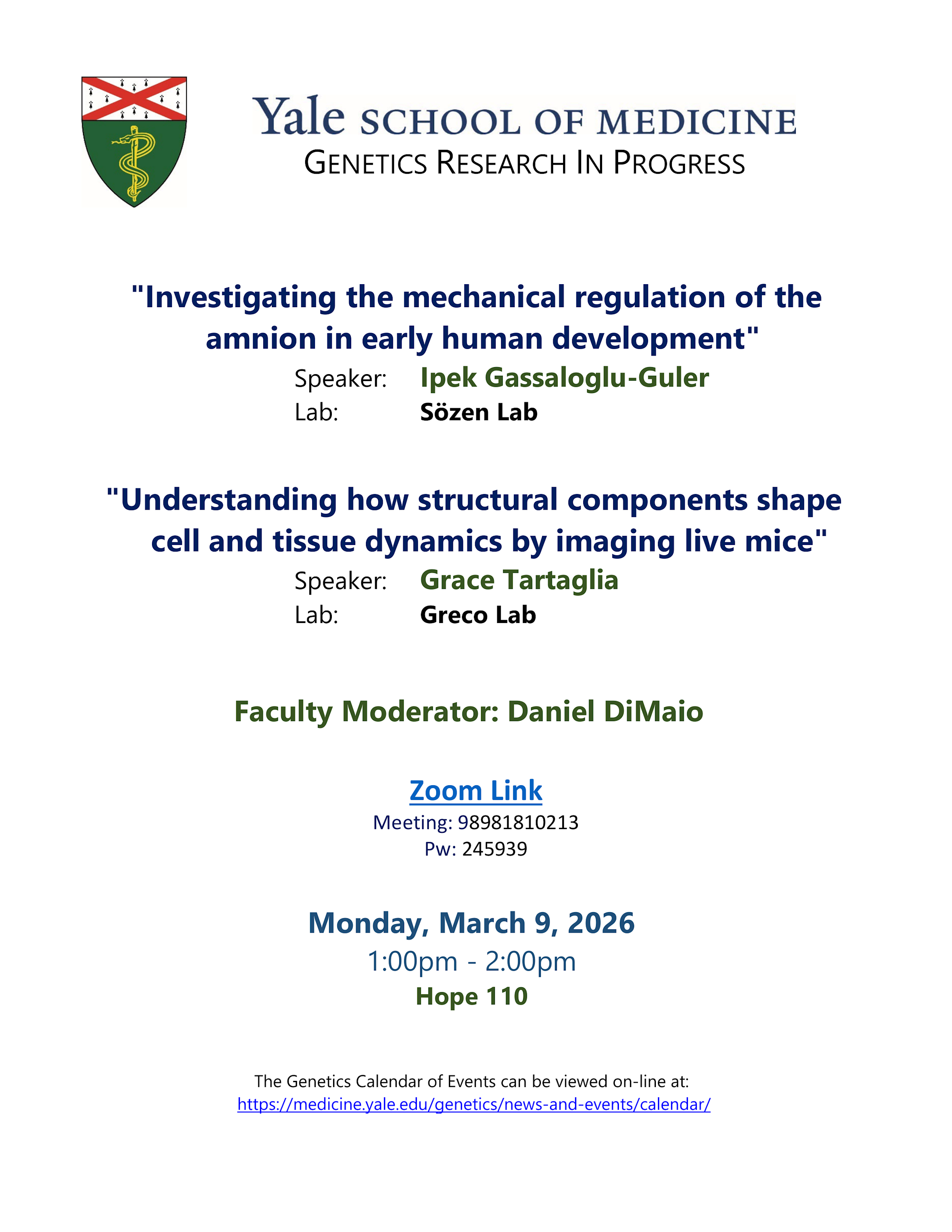 Everyone (Public)Genetics Research-In-Progress (RIP)Add event to CalendarSpeakersGrace Tartaglia, PhDPostdoctoral AssociateIpek Gassaloglu GulerGraduate School Student; PhD candidate, GeneticsContactJames Longjames.long@yale.eduHostDaniel DiMaio, MD, PhDdaniel.dimaio@yale.eduHost OrganizationGeneticsAdmissionFreeEvent TypeLectures and SeminarsFoodLunchMar 20269Monday1:00 PM2:00 PMDownload FlyerEdit This Event