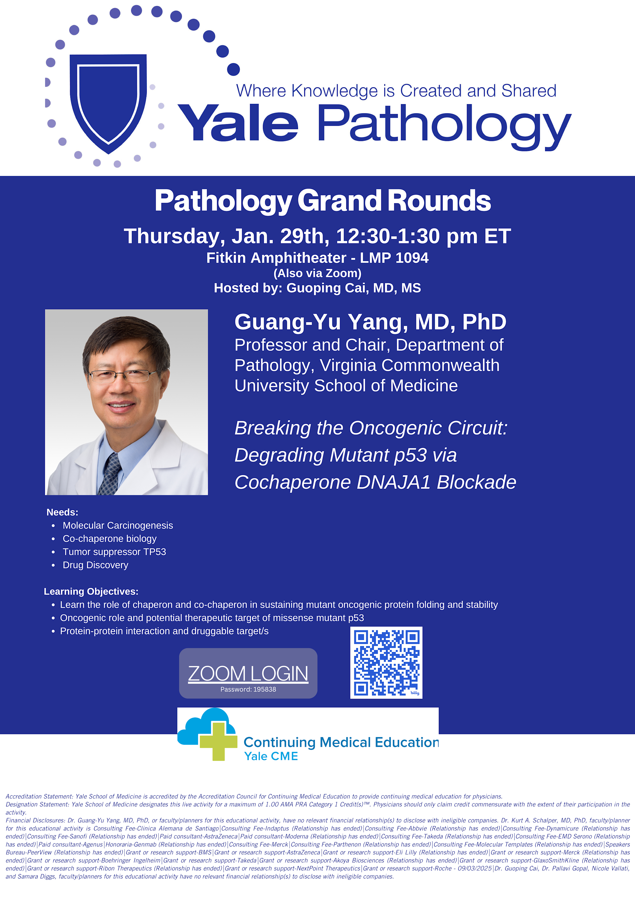 Guang-Yu Yang, MD, PhD, Professor and Chair, Department of Pathology, Virginia Commonwealth University School of Medicine, presents on, "Breaking the Oncogenic Circuit: Degrading Mutant p53 via Cochaperone DNAJA1 Blockade."