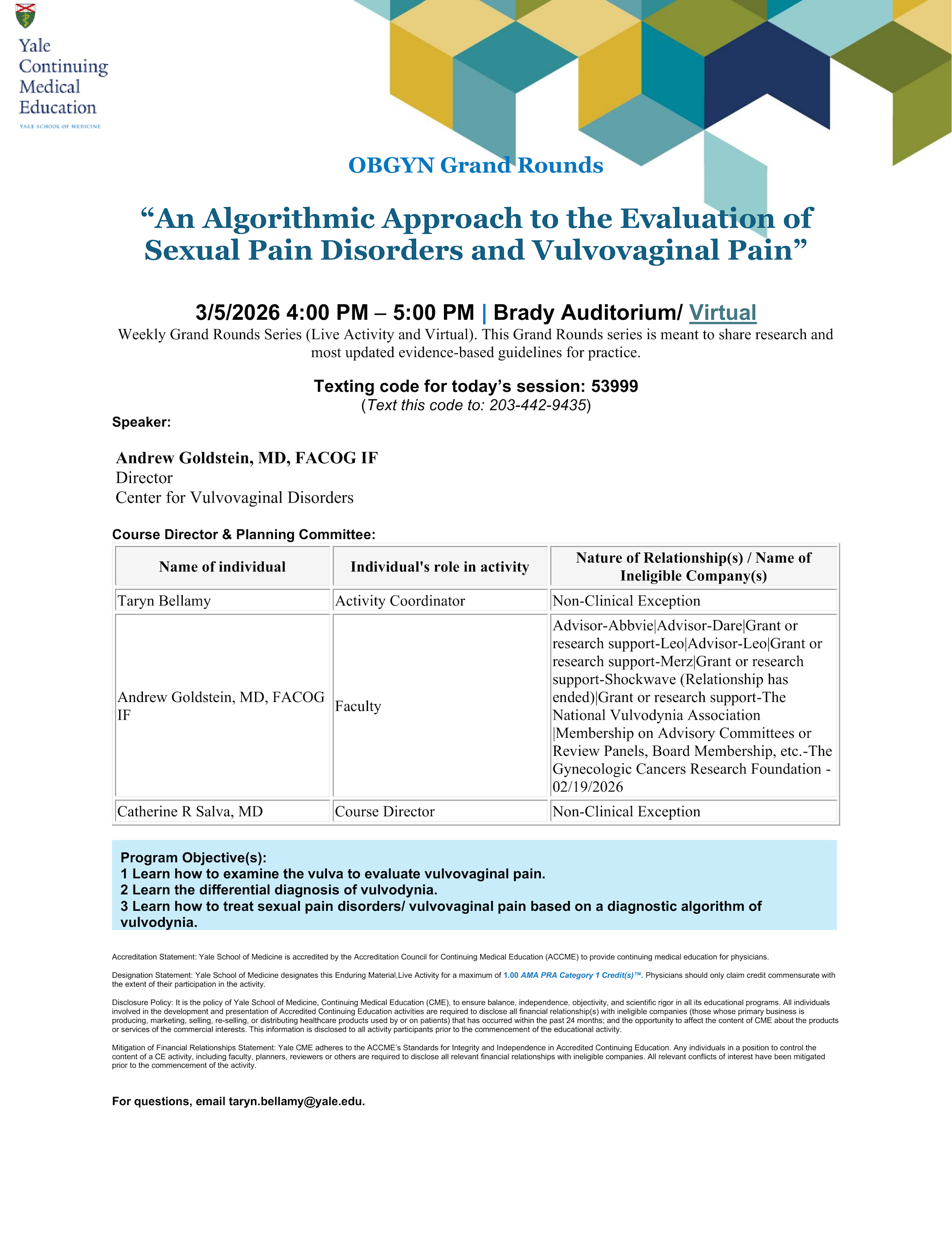 OBGYN Grand Rounds by Andrew Goldstein, MD on "An Algorithmic Approach to the Evaluation of Sexual Pain Disorders and Vulvovaginal Pain"