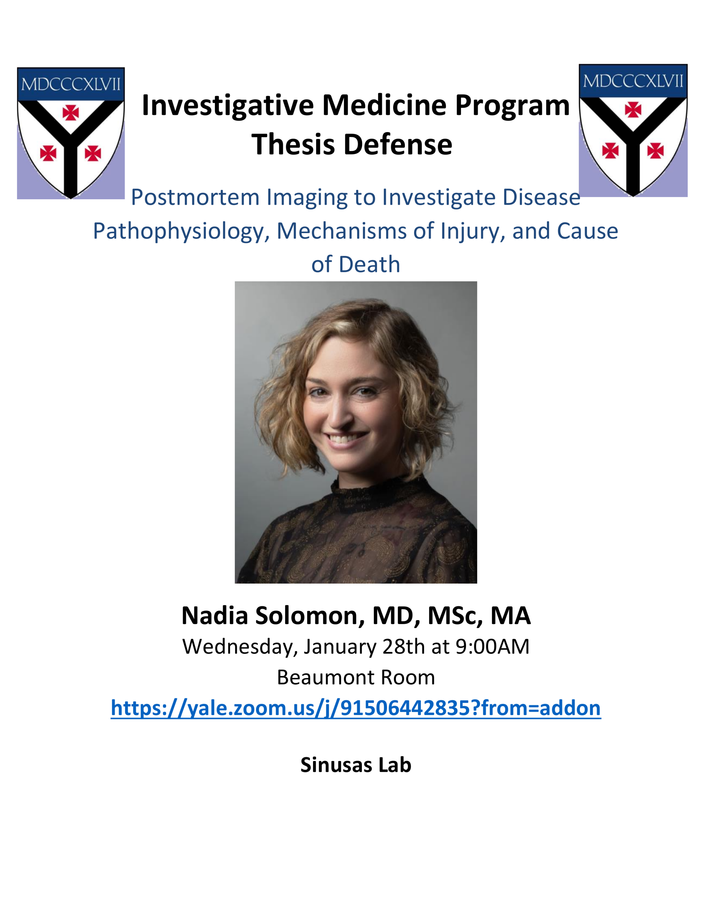 Please join the Investigative Medicine Program as one of our students, Nadia Solomon, defends her thesis. For those who would like to attend but cannot make it, there will be a zoom option.