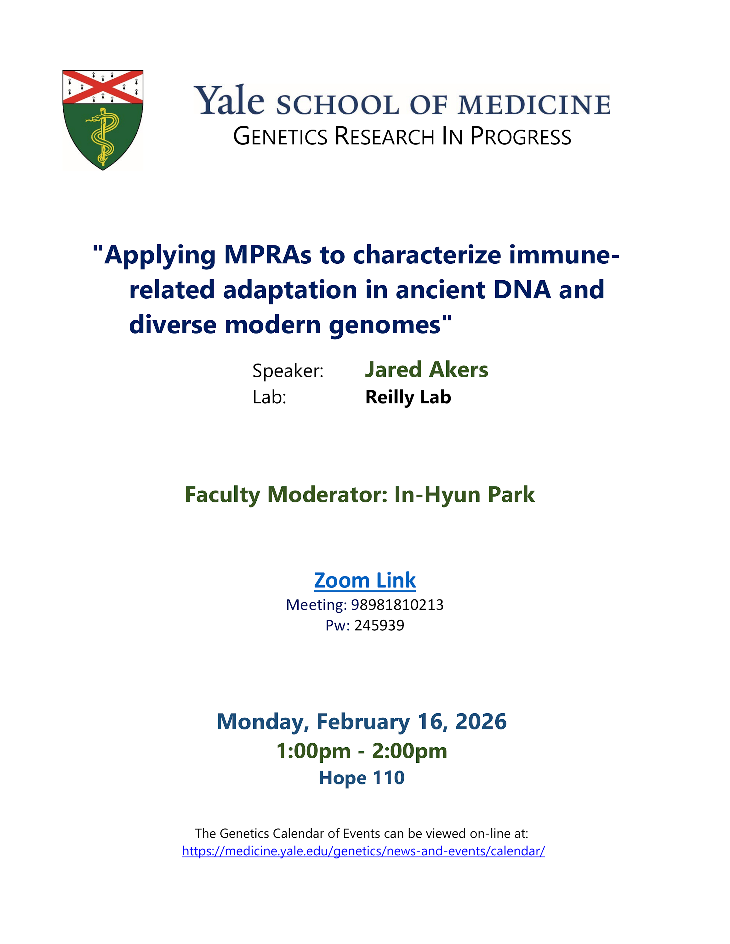 Yale OnlyGenetics Research-In-Progress (RIP)Hope Memorial BuildingAdd event to CalendarAdd event series to CalendarSpeakerJared AkersContactJames Longjames.long@yale.eduHostIn-Hyun Park, PhDinhyun.park@yale.eduHost OrganizationGeneticsAdmissionFreeEvent TypeLectures and SeminarsFoodLunchNext upcoming occurrences of this eventApr 202627MondayEventGenetics Research-In-Progress (RIP)Speakers: Mackenzie Noon, Cara Ly1:00 PM2:00 PMMay 202611MondayEventGenetics Research-In-Progress (RIP)Speakers: Pieter Martino, Fiona Sievers1:00 PM2:00 PMFeb 202616Monday1:00 PM2:00 PMDownload FlyerEdit This Event