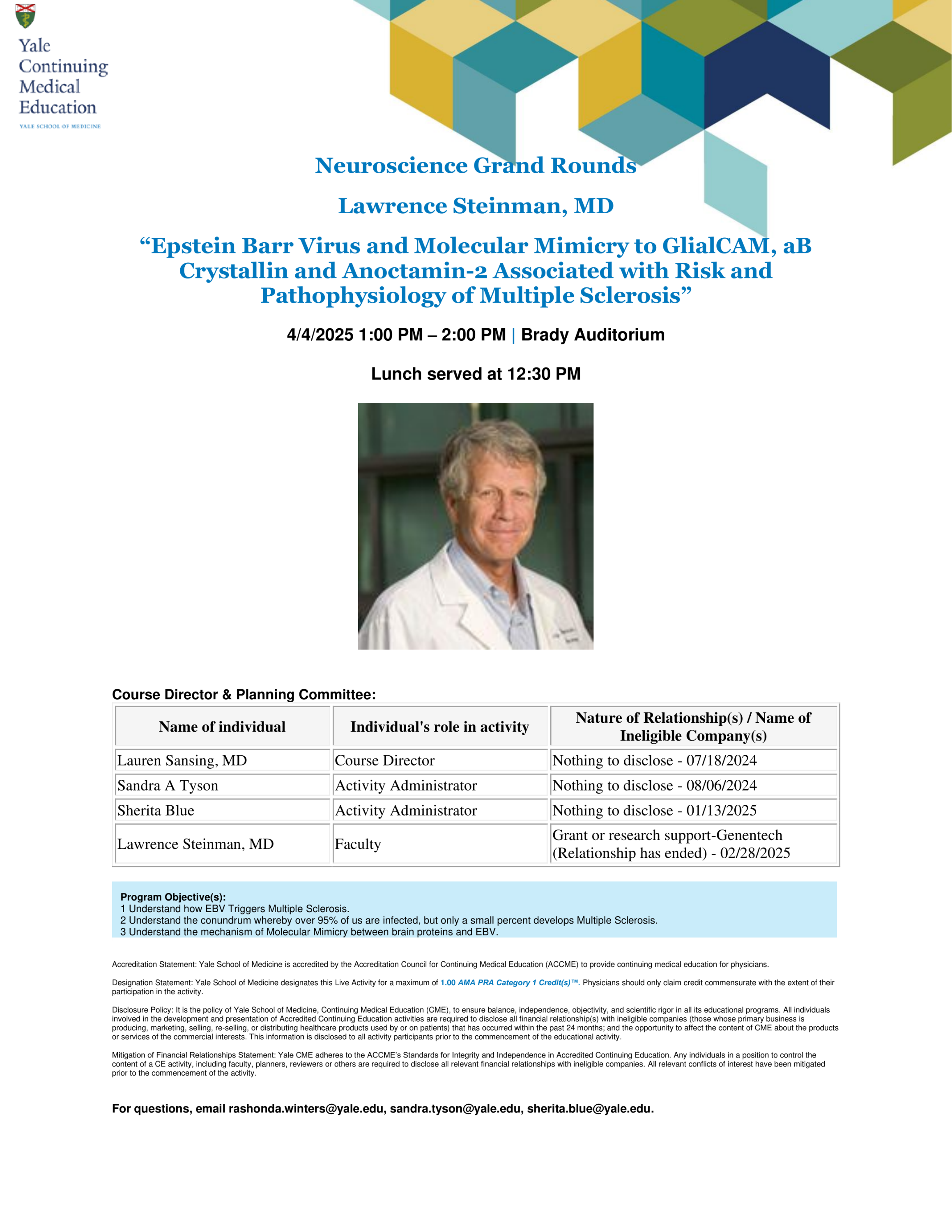 Dr. Lawrence Steinman has been a faculty member at Stanford University since 1980. He is an elected member of both the National Academy of Sciences and the National Academy of Medicine. Dr. Steinman’s research primarily focuses on multiple sclerosis (MS) and has led to the development of two approved MS drugs: Natalizumab and Ublituximab. This talk will center on his work on Epstein-Barr virus (EBV) and GlialCAM.