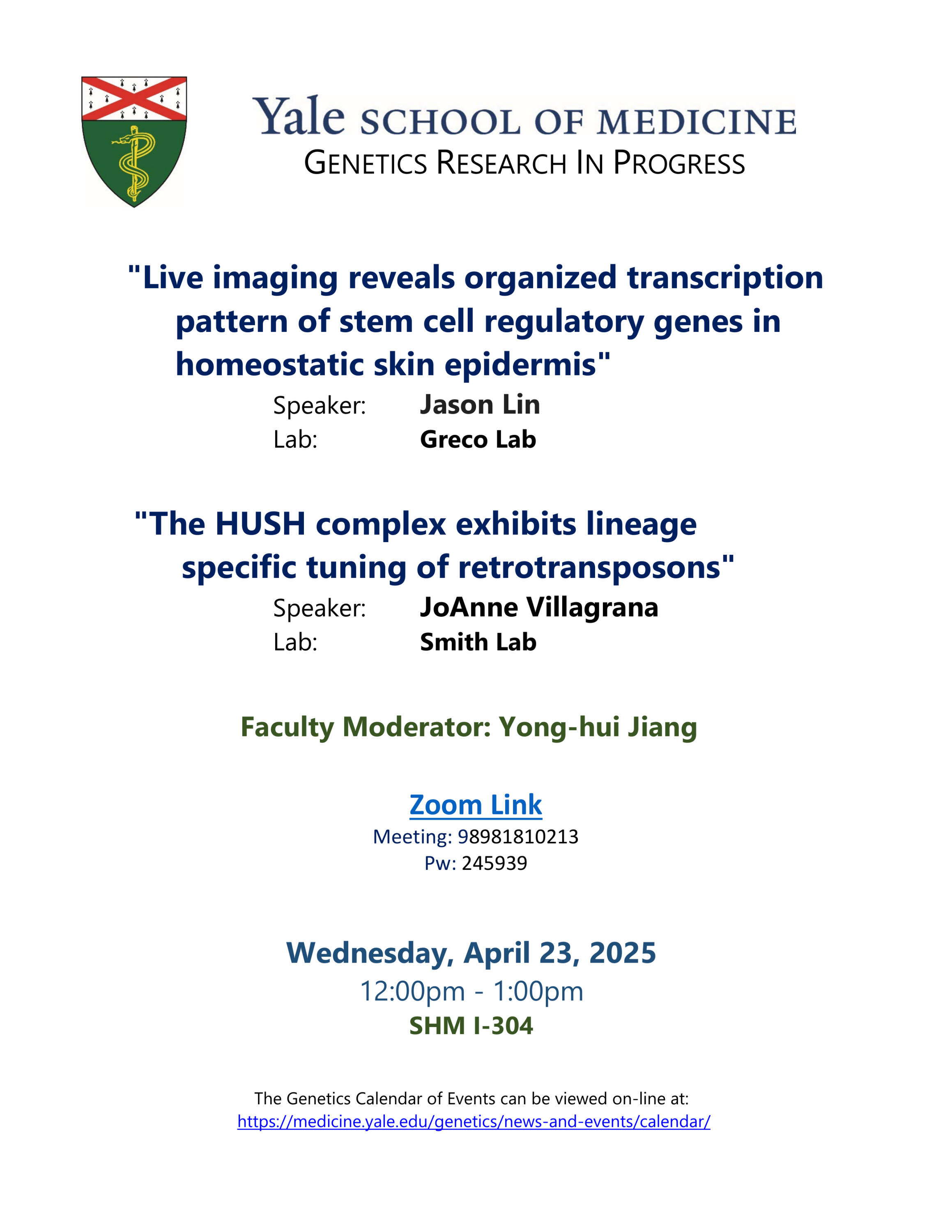 Yale OnlyGenetics Research-In-Progress (RIP)Sterling Hall of Medicine, I-WingAdd event to CalendarAdd event series to CalendarSpeakersJoAnne VillagranaZhongqi (Jason) LinContactJames Longjames.long@yale.eduHostYong-Hui Jiang, MD, PhDyong-hui.jiang@yale.eduHost OrganizationGeneticsAdmissionFreeEvent TypeLectures and SeminarsFoodLunchApr 202523Wednesday12:00 PM1:00 PMDownload FlyerEdit This Event