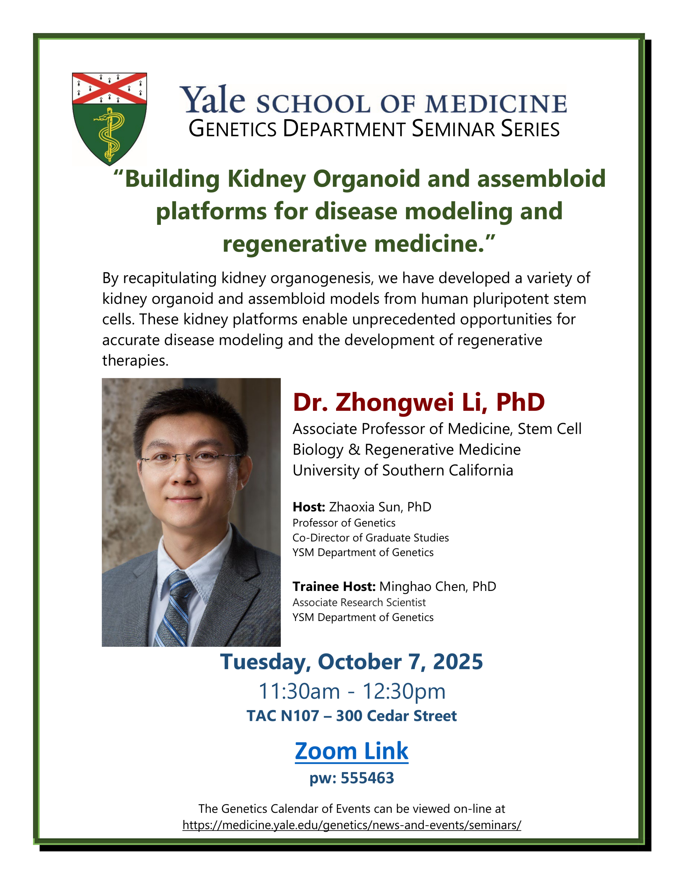 Genetics Department Seminar Series: “Building Kidney Organoid and Assembloid Platforms for Disease Modeling and Regenerative Medicine”